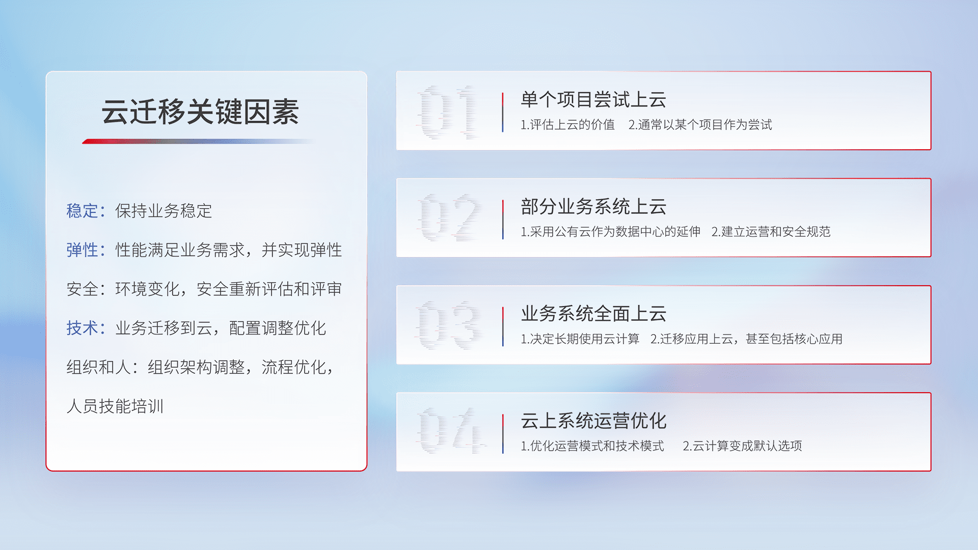 结合实际业务,,,,从规划设计、、、、云平台选型、、云原生改造、、、数据迁移、、集成交付,,,迁移全过程为客户识别最佳上云路径,,做好风险识别管理,,设计网络架构、、身份权限、、、安全审计合规、、、、操作审计、、日志审计、、、监控告警策略、、、、多站点容灾设计等,,,,对云上基础设施进行整体规划,,提升IT治理水平,,以满足弹性、、高可用、、高性能的需求。。。。