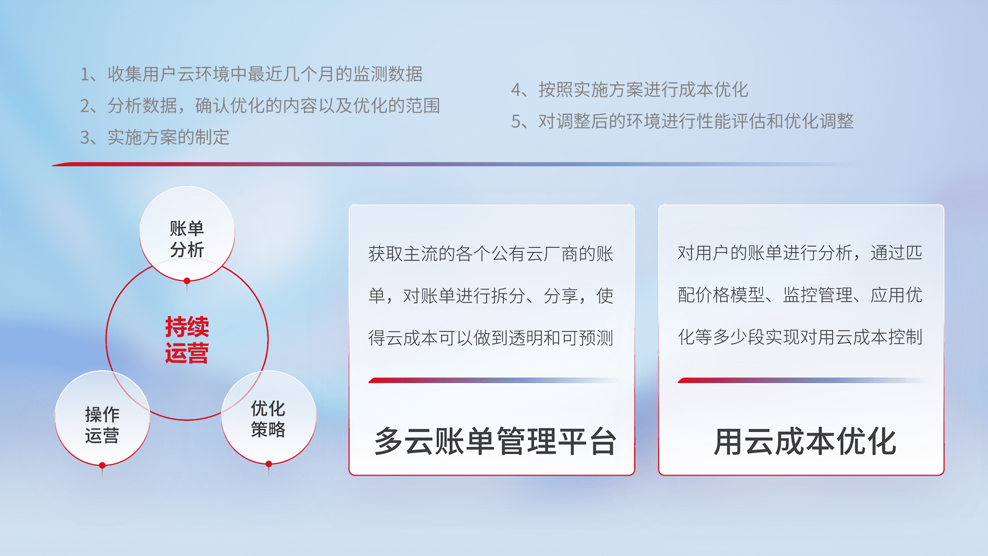 通过多云纳管,,,,以统一的资源数据模型把客户的云资源进行抽象和封装,,,,进而实现对多云资源的统一操作,,,,保障云资源管理的可靠性、、稳定性与可用性。。。量身定制化运维内容,,,配置、、、、开发运维、、补丁管理、、、、备份、、监控、、、、认证和访问管理、、、审计和日常巡检等,,保障在用云过程中的可靠度,,,,稳定度以及高可用率。。。。